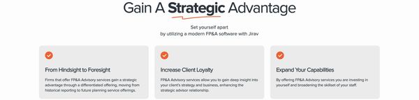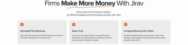 From this point onward, the ROI is instant: Revenue earned from delivering FP&A Advisory to the first client usually pays for the entire Jirav Partner Platform.