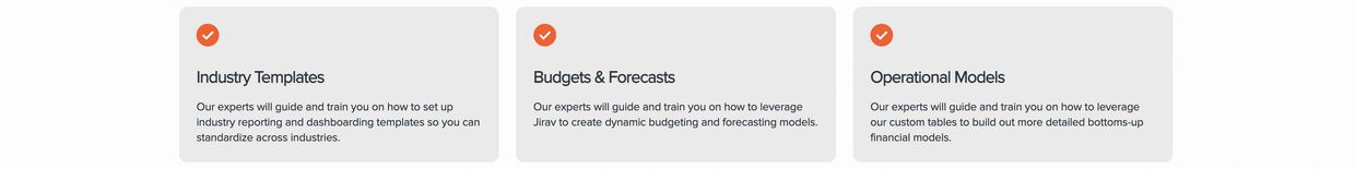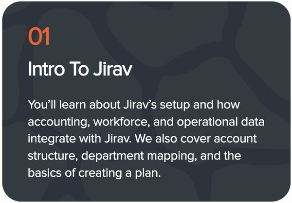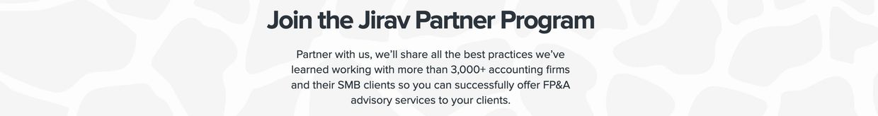 You and your team will receive full on-boarding and implementation support, to both learn about the Jirav Partner Platform, and to set up and deliver FP&A insights to a live client of your choice - all in a few weeks. The revenue from this first client engagement typically covers your entire platform investment — you are profitable from the very first deployment.
